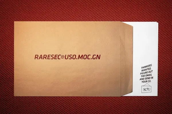 “Thinkers wanted. Figure out the email, and send in your CV.”
